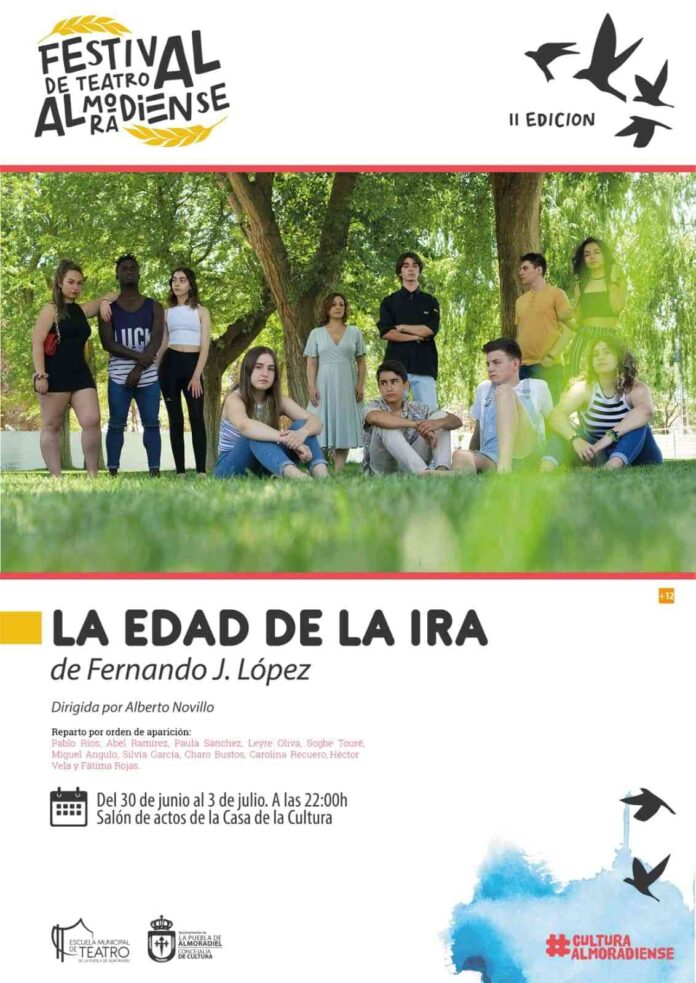 Desde el pasado día 23 de junio, y hasta el 31 de julio, en la Puebla de Almoradiel (Toledo) se viene celebrando el II Festival de Teatro Almoradiense. En esta ocasión ha sido la obra «La edad de la ira» de Fernando J. López la que se ha subido al tablado el 30 de junio y los días 1, 2 y 3 de julio. Gran cantidad de público ha podido disfrutar del talento de estos jóvenes actores y actrices.