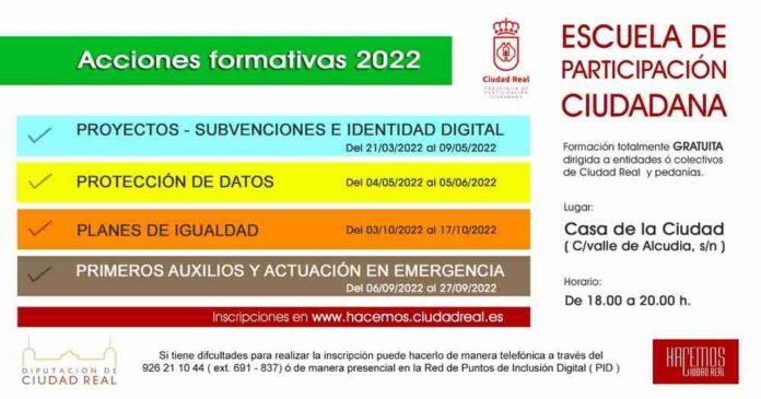 La concejala de Participación Ciudadana, Sara Martínez, informaba esta mañana sobre las diferentes actividades de formación que se van a llevar a cabo en la Escuela de Participación Ciudadana para 2022. Todas ellas totalmente gratuitas y dirigidas a entidades, asociaciones o colectivos de Ciudad Real y las pedanías con el objetivo principal de “potenciar ese tejido asociativo de la ciudad tan activo, para seguir dotándolo de herramientas que les permitan mejorar en su acción diaria, en sus actividades y eventos”.