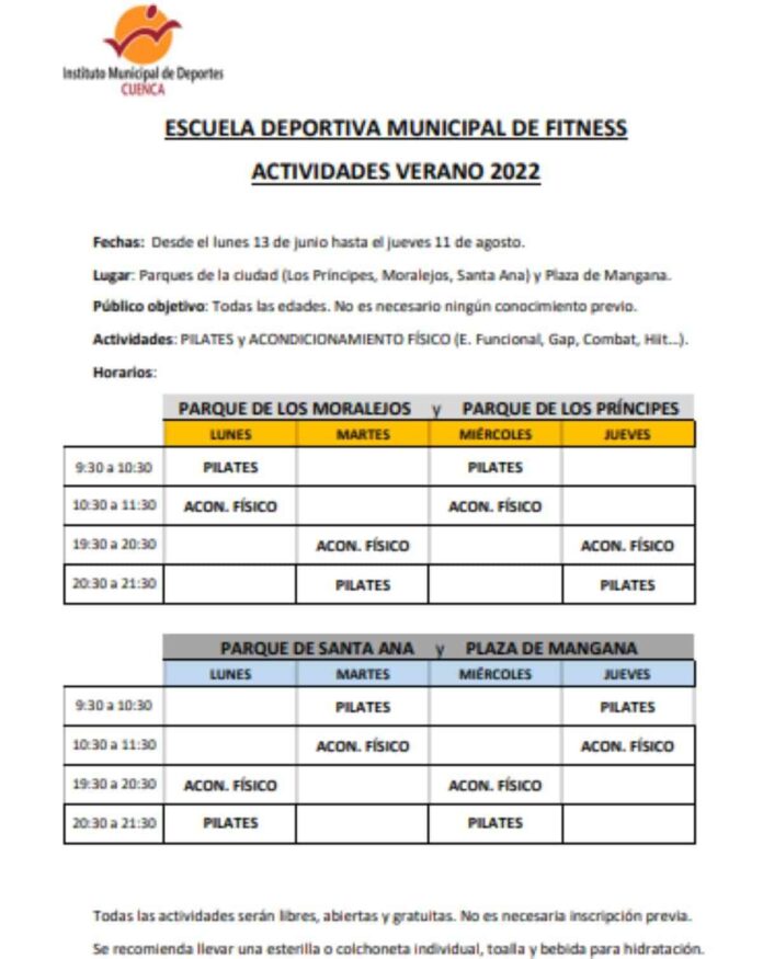 La escuela de verano de fitness se llevará a cabo en los parques de Los Moralejos, Los Príncipes, Santa Ana y en la Plaza de Mangana del 13 de junio al 11 de agosto. Así lo dio a conocer hoy, la concejala de Deportes del ayuntamiento de Cuenca, Charo Rodríguez.