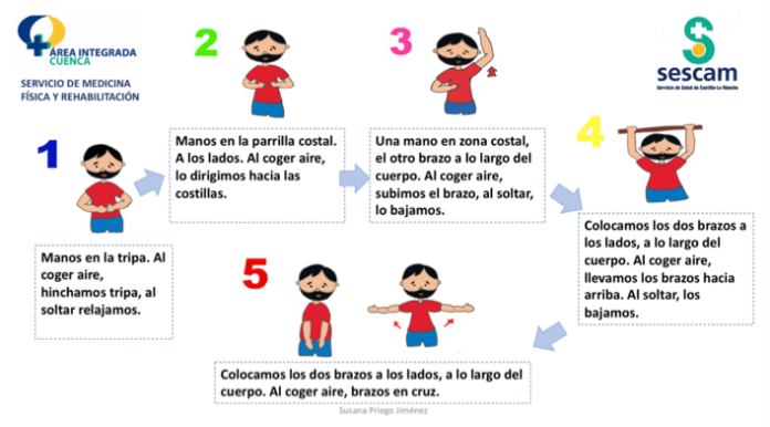 Para comenzar a tratar a estos pacientes, el Área de Fisioterapia Respiratoria de la Sociedad Española de Neumología y Cirugía Torácica (SEPAR) ha creado la “Guía de Fisioterapia Respiratoria en el Manejo del Paciente con COVID-19: Recomendaciones Generales”. En ella se incluyen ejercicios que se pueden dividir en varias fases: fase de confinamiento, en aquellos pacientes que presentan síntomas leves y pasan la cuarentena en su domicilio; fase de ingreso hospitalario; de agudización o período crítico; y de recuperación y alta hospitalaria.