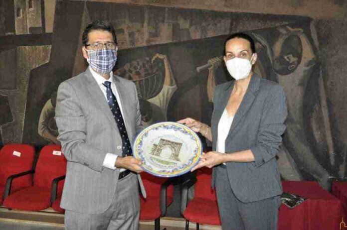 Caballero ha recibido de manos de la alcaldesa de Ciudad Real un plato de cerámica conmemorativo de la Pandorga 2021. Y Cantero le ha impuesto el tradicional pañuelo de «yerbas» en el salón de Plenos de la Diputación provincial.