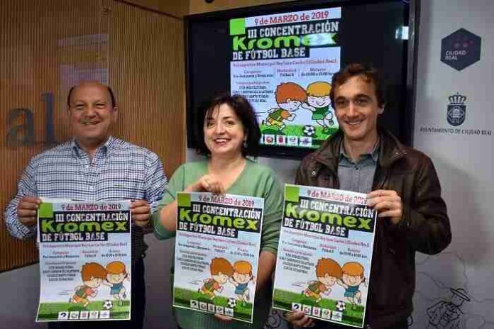 La concejala de Deportes, Nohemí Gómez-Pimpollo, el director de la Escuela Municipal de Fútbol de Ciudad Real, Rafa Dina, y Carlos Martín de Kromex, han presentado esta mañana la tercera concentración Kromex de fútbol base que se celebrará este sábado en el Polideportivo Rey Juan Carlos I.