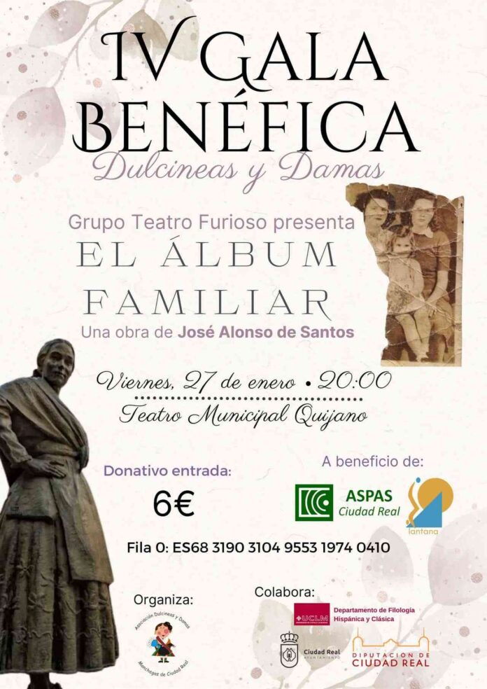 La Asociación Cultural de Dulcineas y Damas Manchegas ha presentado esta mañana la IV Gala Benéfica, que se va a llevar a cabo el viernes 27 de enero, a las 20.00 horas, en el Teatro Municipal Quijano, con la representación de la obra “El álbum familiar” por el grupo de Teatro Furioso, en colaboración con el Ayuntamiento de Ciudad Real y cuya recaudación irá destinada a dos asociaciones locales ASPAS y LANTANA.