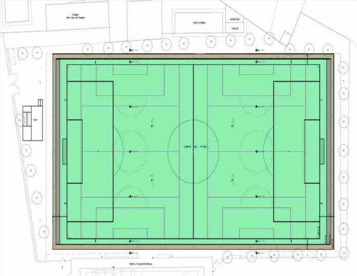 Se pretende realizar un nuevo campo con acabado en césped artificial, de última generación que sea adecuado para la práctica de futbol 11, y que a su vez servirá en sentido transversal para dos campos de futbol 7. Se establecerá también un sistema drenante para la recogida de aguas del terreno circundante, y se instalará una red de riego de polietileno de 90 mm de diámetro a lo largo de todo el perímetro del campo y seis aspersores de gran alcance. Además se adecuará la instalación eléctrica existente para que pueda funcionar con normalidad.