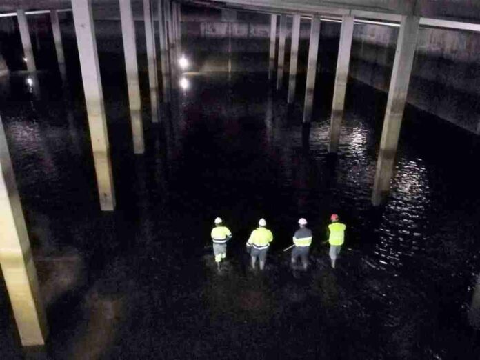 Estos trabajos consisten en la reducción controlada, por consumo, del volumen almacenado en cada uno de los dos vasos de almacenamiento hasta el nivel mínimo de seguridad, a partir del cual se realiza el vaciado total, cepillado y limpieza de los pequeños sedimentos acumulados en el fondo. También se realiza el cepillado y limpieza con agua presurizada de paredes, pilares y todos los elementos que están normalmente en contacto con el agua, para finalmente realizar la total desinfección mediante un proceso de hipercloración y posterior neutralización y enjuague con agua.