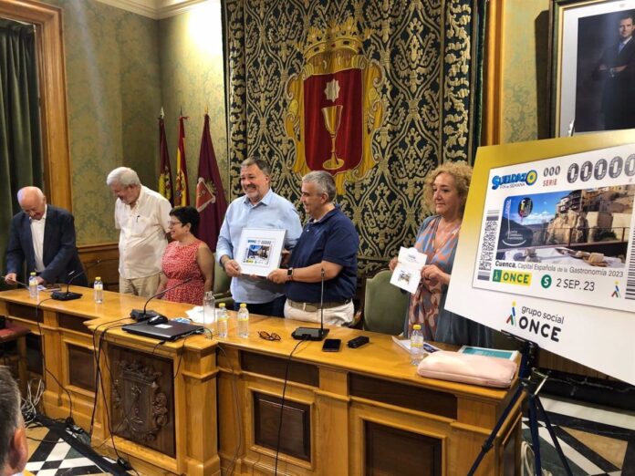 La imagen del cupón revelada durante el evento corresponde al menú que se sirvió en el Puente San Pablo durante las actividades previas a la designación de Cuenca como Capital Española de la Gastronomía. Los 5,5 millones de cupones para el sorteo del 2 de septiembre ya están a la venta.