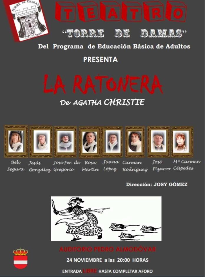 “La ratonera» la célebre obra teatral de la autora Agatha Christie presentará el grupo de teatro “Torre de Damas” en el programa de educación básica de adultos, el próximo jueves, 24 de noviembre, a las 20 horas, en el Auditorio Municipal de Puertollano (Ciudad Rea) con entrada gratuita.