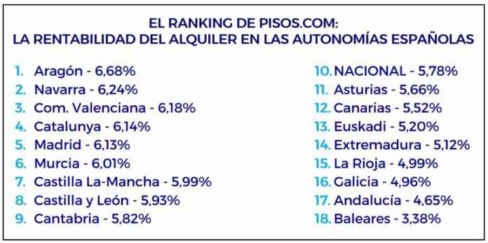 El ranking de pisos.com sobre la rentabilidad bruta del alquiler de viviendas en España dibuja una horquilla que va desde una rentabilidad del 6,68% registrada en Aragón al 3,38% de Baleares. Así, en el análisis por comunidades autónomas, los precios competitivos para la compra de residencias en autonomías como Aragón, Navarra y la Comunitat Valenciana las colocan junto a Catalunya y Madrid en lo alto de una lista que cierran Galicia, Andalucía y Baleares, esta última por el elevado precio de compra de las propiedades y su elevada superficie. Los aumentos de Catalunya y Madrid, que en ediciones anteriores del ranking se movían alrededor del 5%, se deben a la corrección de los precios de compra registrada en el primer trimestre y al comportamiento estable de la demanda de alquiler.