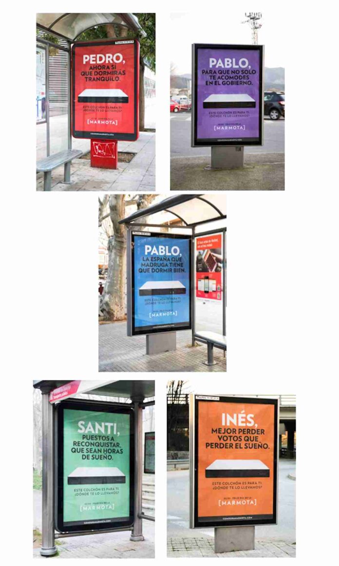 Los mensajes en tono divertido se han podido leer en diferentes soportes publicitarios del país, frases tan ingeniosas como : ‘Pedro, ahora sí que dormirás tranquilo’ dirigido a Pedro Sánchez; ‘Pablo, para que no solo se acomode en el gobierno’ dirigido a Pablo Iglesias : ‘Santi, puestos a reconquistar que sean horas de sueño’, un mensaje directo y crítico con el líder de Vox España, Santiago Abascal, el de Pablo Casado: Pablo, la España que madruga tiene que dormir bien’ o el de Inés Arrimadas en el que se podía leer: ‘Inés, mejor perder votos que perder el sueño’.