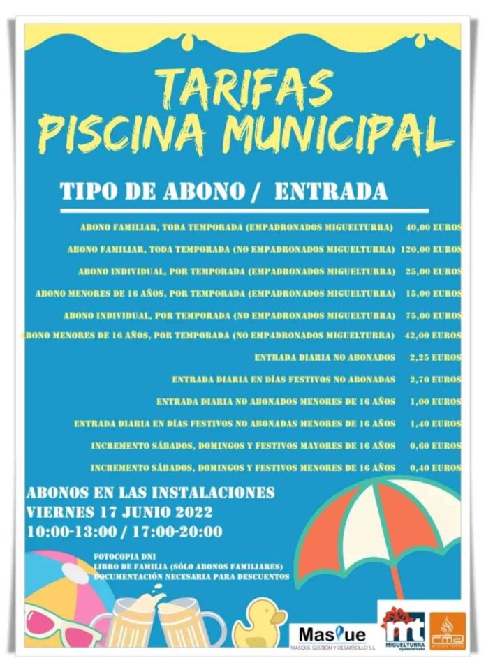 En cuanto a los abonos se pueden realizar a partir del viernes 17 de junio de 10:00 a 13:00 horas y de 17:00 a 22:00 horas, debiendo aportar fotocopia del DNI, libro de familia sólo para abonos familiares y la documentación necesaria que se precise para los descuentos.