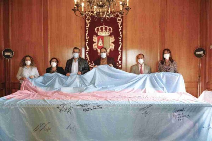 Las Cortes de Castilla-La Mancha enviaron un fuerte mensaje de unidad a favor de la lucha por los derechos de las personas trans, durante una jornada de encuentro con colectivos en la que el presidente del Parlamento autonómico, Pablo Bellido, y la consejera de Igualdad, Blanca Fernández, firmaron una bandera trans que está realizando un recorrido por todas las comunidades autónomas.