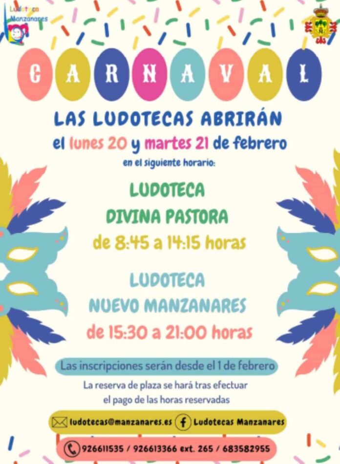 Durante el Carnaval 2023, las ludotecas de Manzanares (Ciudad Real) abrirán los días lunes 20 de febrero y martes 21 de febrero. El horario de las mismas será, Ludoteca Divina Pastora de 8:45 a 14:15 horas. Mientras que en la Ludoteca Nuevo Manzanares será de 15:30 a 21:00 horas.