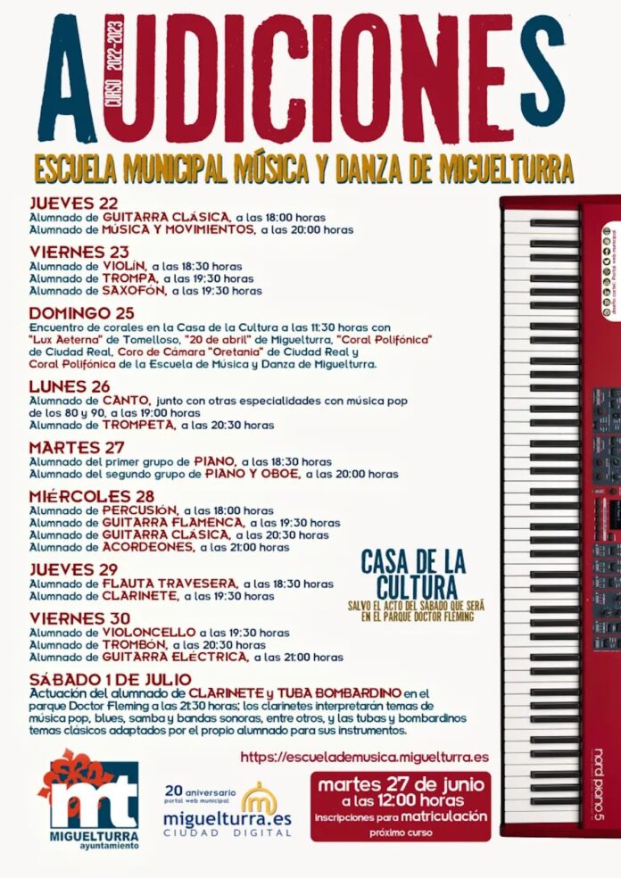 Finalmente informar que el martes 27 de junio a las 12 de la mañana comenzará el proceso de inscripciones para la matriculación en la Escuela de Música y Danza para el curso 2023-2024 a través de la siguiente página web https://escuelademusica.miguelturra.es/