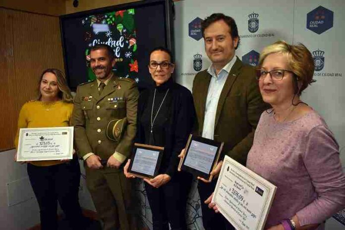 La Concejala de Festejos y Tradiciones Populares, Eva María Masías, acompañada del presidente de la Asociación de Belenistas de Ciudad Real, Antonio Vich, y del sargento primero Juan Ramón Serrano de la Base de Helicópteros de Almagro, ha hecho entrega a Guerreros Púrpura y a FibroReal de la recaudación obtenida en los Belenes Municipales durante esta Navidad y que asciende a 4.200 euros.