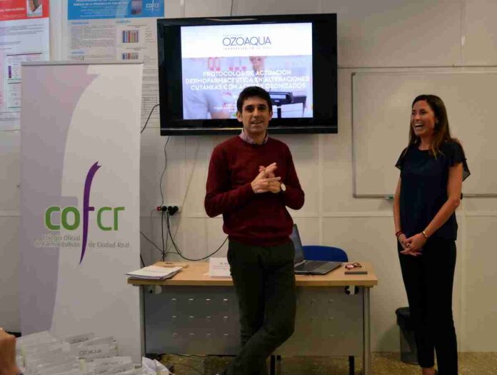 La conferencia, patrocinada por Laboratorios Ozoaqua, estuvo a cargo de la farmacéutica Blanca Llácer Ochoa, vocal de Dermofarmacia y Formulación Magistral del COF de Alicante y profesora del Máster Dermocosmética de la Universidad “Miguel Hernández”, de Elche, a quien presentó Augusto Ortega, farmacéutico del Centro de Información al Medicamento del COF de Ciudad Real.