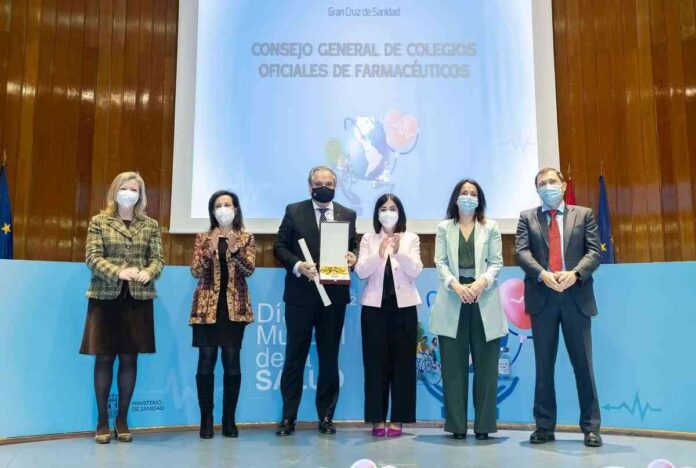 Jesús Aguilar, presidente del Consejo General de la Facultad de Farmacia, ha recogido hoy en nombre de todos los farmacéuticos españoles y de manos de la ministra de Sanidad Carolina Darias la Gran Cruz de Sanidad Civil por esta labor estos profesionales sanitarios durante la pandemia. Médicos y enfermeros también recibieron el galardón por su labor “cuidando a los ciudadanos en tiempos de crisis”, tal y como dijo la ministra de Sanidad durante la entrega de la Gran Cruz en la sede del Ministerio de Sanidad hoy en la celebración del Día Mundial de la Salud.