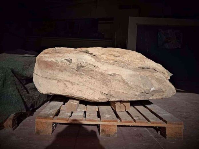 Un gran bloque de roca caliza, de varias toneladas de peso, que contiene restos óseos de un posible dinosaurio del Cretácico Inferior de hace unos 126 o 129 millones de años ha sido trasladado al Museo Paleontológico de Castilla-La Mancha (MUPA) para su estudio.
