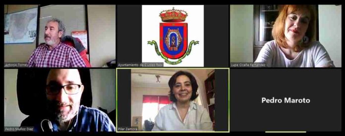 La alcaldesa de Ciudad Real, Pilar Zamora, y el concejal de Promoción Económica y presidente del IMPEFE, Pedro Maroto, han mantenido una reunión virtual con representantes de los sindicatos mayoritarios en la provincia de Ciudad Real, Comisiones Obreras, UGT y CSIF, para abordar las medidas de actuación en la salida de la crisis provocada por el COVID-19. En la reunión han participado Pedro Muñoz de Comisiones Obreras, Antonio Torres, de UGT y Lupe Ocaña, de CSIF.
