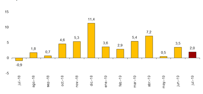 El gasto total realizado por los turistas internacionales que visitan España en julio alcanza los 11.980 millones de euros, con un aumento del 2,0% respecto al mismo mes de 2018.