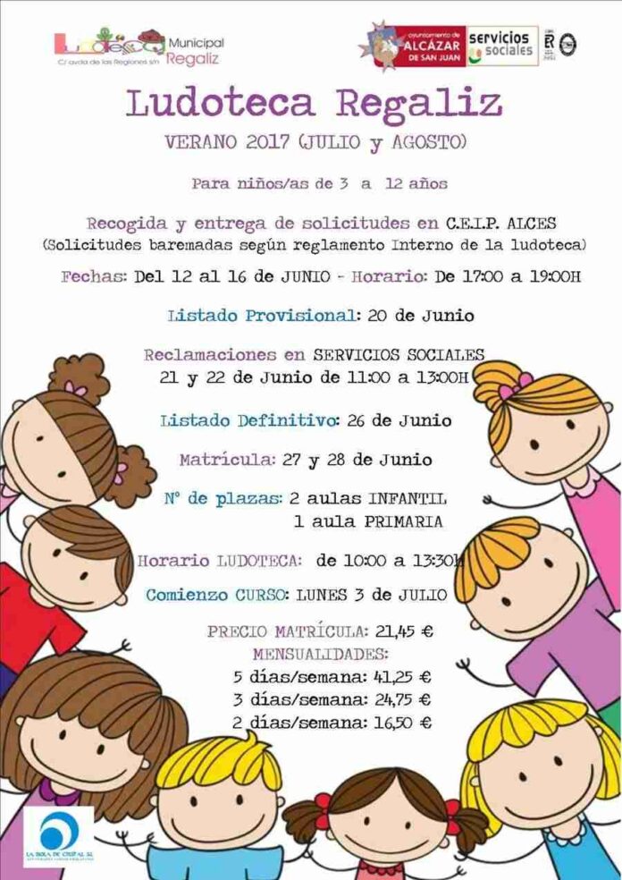 En esta ocasión os traemos información sobre la Ludoteca Regaliz (Colegio Alces) y la Ludoteca La Rayuela (Cruz Roja). Ambas ludotecas abrirán el periodo de recogida y entrega de solicitudes del 12 al 16 de junio, para niñas y niños de 3 a 12 años.