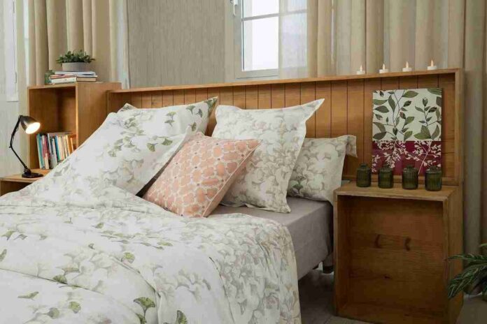 El estilo natural puede ir acompañado de tejidos que aporten elegancia y serenidad al dormitorio. En este caso, los colores piedra en edredones y sábanas le dan un toque personal y sofisticado.