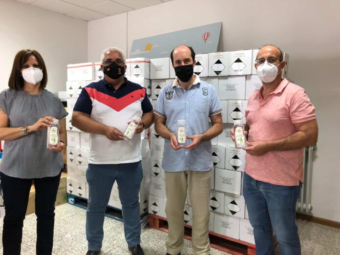 El presidente de Mancha Norte, Carlos Ortiz, ha entregado esta mañana al alcalde de Arenales de San Gregorio, Iván Olmedo, el lote de gel hidroalcohólico que será repartido en los comercios de su localidad. Se trata de la primera entrega de este producto, que anima en su etiqueta a apoyar a los comercios y restaurantes de los pueblos de toda la comarca, y que será repartido en los diferentes establecimientos de Campo de Criptana, Tomelloso, Socuéllamos, Pedro Muñoz, Alcázar de San Juan, Alameda de Cervera, Cinco Casas y Herencia.