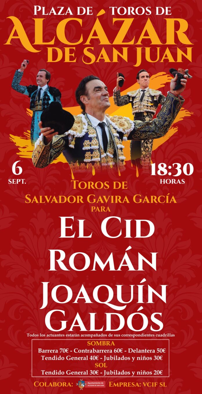 La Plaza de Toros de Alcázar de San Juan se prepara para una tarde de emociones el próximo sábado 6 de septiembre a las 18:30 horas, con la celebración de la tradicional Gran Corrida de Toros de Feria y Fiestas. Este evento contará con seis ejemplares de la prestigiosa ganadería de Salvador Gavira García y reunirá a tres destacados matadores: Manuel Jesús “El Cid”, Román y Joaquín Galdós, junto con sus cuadrillas respectivas.