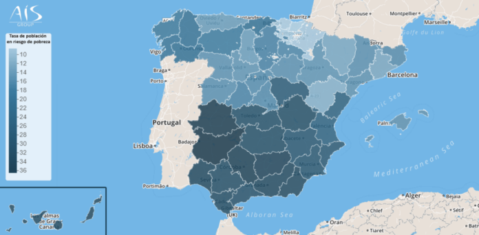 Los datos de población en riesgo de pobreza dibujan una clara frontera norte-sur en el territorio español. Siendo las provincias extremeñas, andaluzas y canarias, las que presentan unos porcentajes más altos.