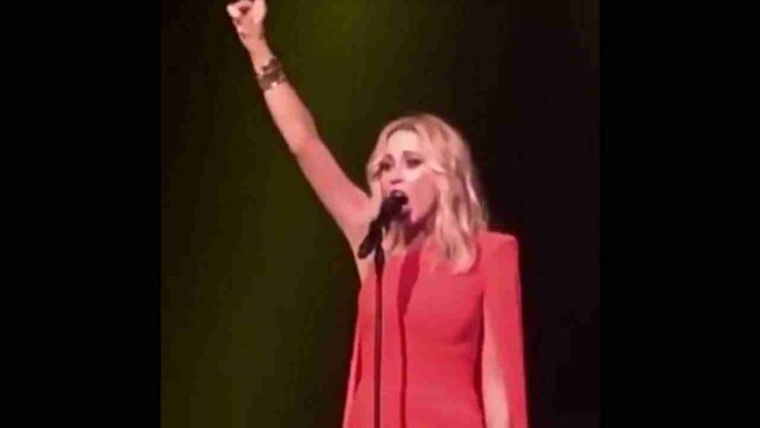 El cierre del concierto de Marta Sánchez en el teatro de La Zarzuela se realizó con una emotiva versión del himno de España, al que ella misma ha puesto letra. Un gesto de amor por su país, que entusiasmo al público para celebrar su treinta años de trayectoria musical.
