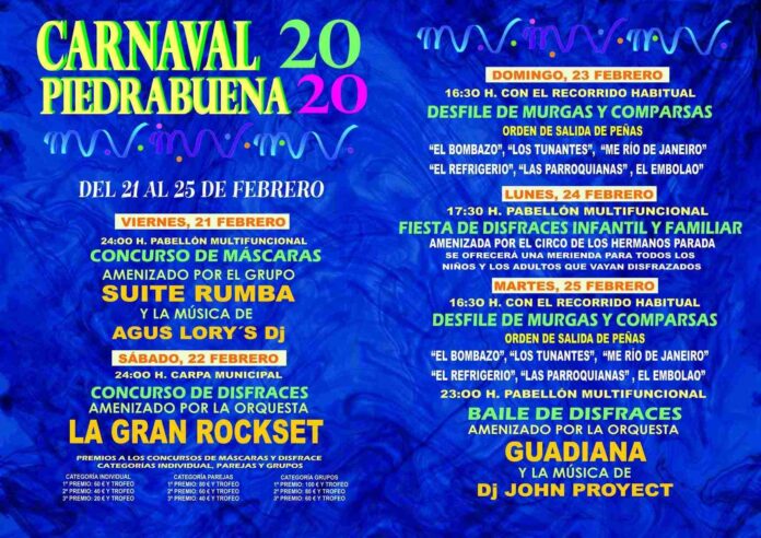 De este modo, este viernes, 21 de febrero, a media noche, comenzará el Concurso de Máscaras en el Pabellón Multifuncional donde habrá premios en categoría individual, parejas y grupos, todo ello amenizado por el grupo “Suite Rumba” y la música del Dj Agus Lory’s. De esta manera, el Ayuntamiento reconocerá el esfuerzo de los participantes con premios dotados con 60, 40 20 euros y trofeo para los disfraces individuales; con 80, 60 y 40 euros y trofeo en la categoría de parejas y 100, 80 y 60 euros con trofeo, en la de grupos.
