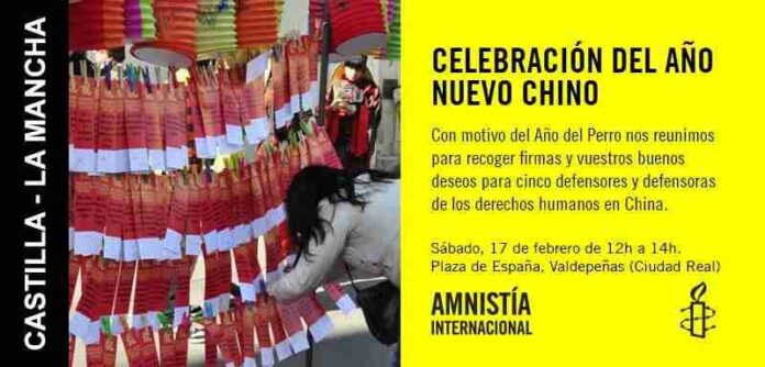 El 16 de febrero se celebra el año nuevo chino, el año del perro, abriendo paso a las fiestas de primavera, que son las más importantes en China. Las familias acostumbran reunirse y expresar sus buenos deseos para el año que comienza. Con motivo de estas simbólicas fechas, Amnistía Internacional en Valdepeñas se une a la octava edición de la campaña por mejorar los derechos humanos en China. Un acto de recogida de mensajes de buenos deseos para cinco casos emblemáticos de lucha por los derechos humanos se celebrará el 17 de febrero de 12h a 14h en la Plaza de España.