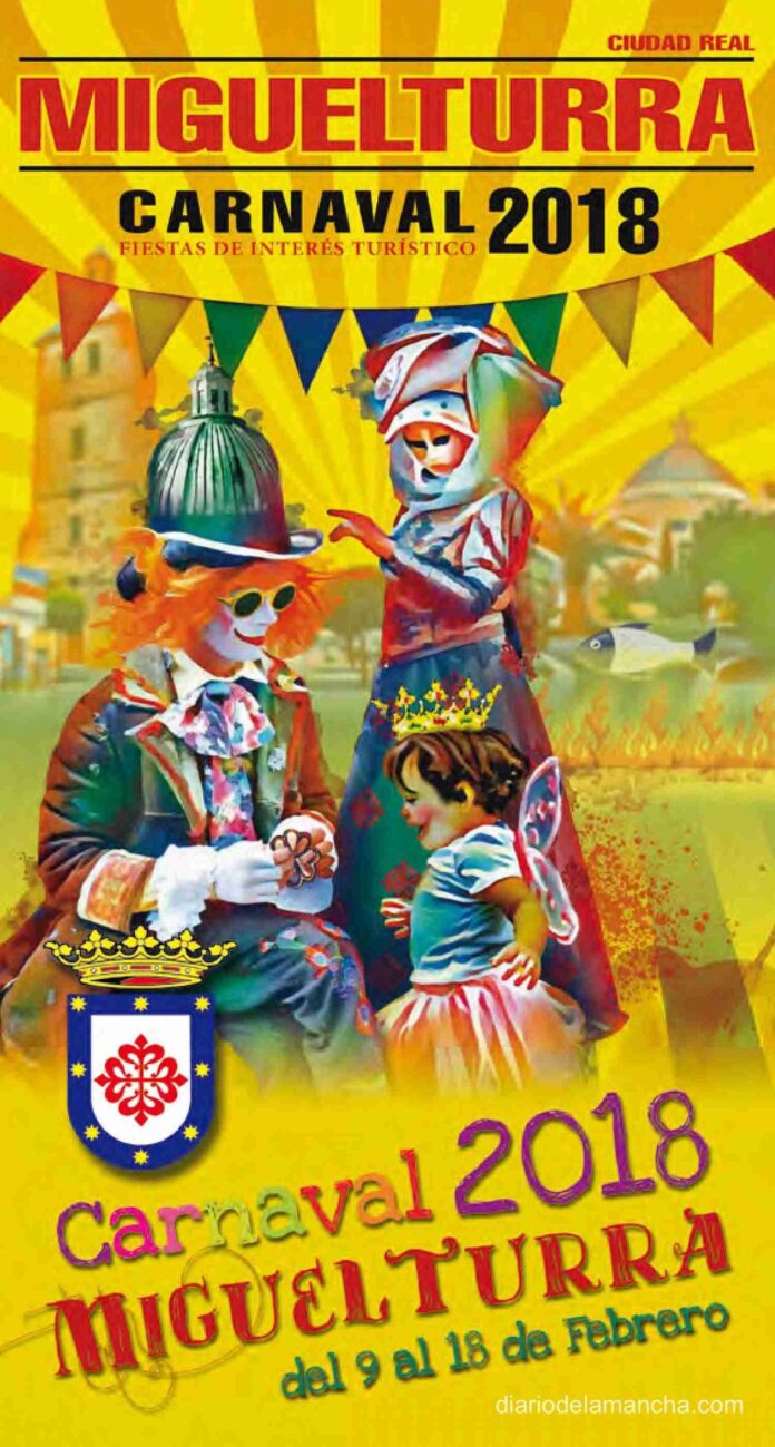 En el Palacio del Carnaval (CERE) Pregón a cargo de Miguel Ángel Rodríguez “El Sevilla”; finalizado el pregón se entragará el premio a la ganadora del concurso de carteles del Carnaval 2018 Estela Fernanda Agüero. También se hará entrega de un estuche de licores patrocinado por “La Gaditana”, acto presentado por Radio Miguelturra, emisora oficial del Ayuntamiento de Miguelturra, la cual retransmitirá en directo este evento. Pueden acceder a su escucha a través de internet a través de los botones ubicados a la derecha del portal en cualquiera de las páginas.