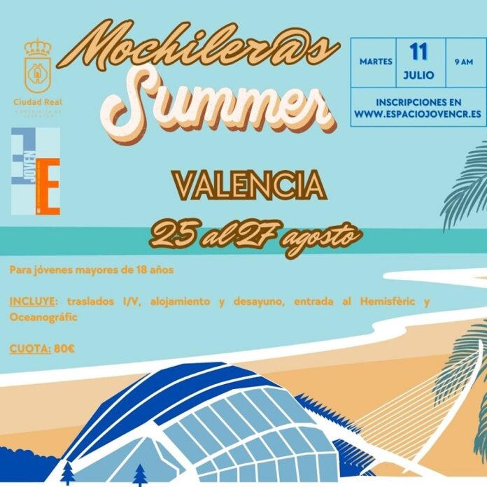 Participa de la actividad mochiler@s Summer Valencia, para jóvenes de Ciudad Real mayores de 18 años, que tendrá lugar los días 25, 26 y 27 de agosto. Organizado por el Espacio Joven del Ayuntamiento de Ciudad Real.