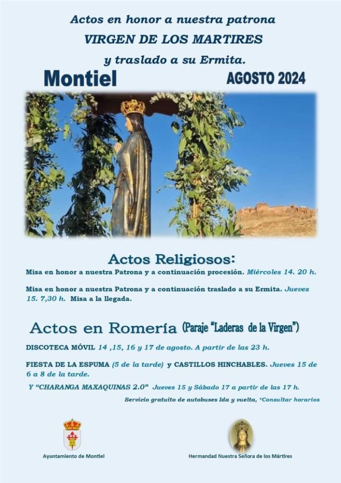 El municipio de Montiel (Ciudad Real) se prepara para celebrar las festividades en honor a la Virgen de los Mártires, su patrona. Desde hoy jueves 14 de agosto hasta el sábado 17 de agosto, se llevarán a cabo diversos actos organizados por el Ayuntamiento de la localidad y por la Hermandad Nuestra Señora de los Mártires.