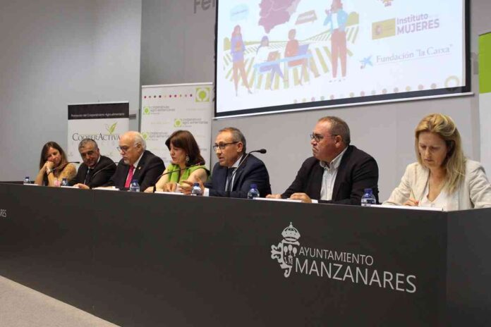 La consejera de Igualdad y portavoz del Gobierno de Castilla-La Mancha, Blanca Fernández, el alcalde de Manzanares, Julián Nieva; el director general de Cooperativas Agro-alimentarias Castilla-La Mancha, Juan Miguel del Real; el presidente de Cooperativas Agro-alimentarias Extremadura, Ángel Pacheco; la técnica de Igualdad de Cooperativas Agro-alimentarias Andalucía, Amparo Martín, y el director de Agrobank en Castilla-La Mancha y Extremadura, Pedro A. Martínez, han sido los encargados de inaugurar esta jornada que ha congregado a cerca de un centenar de mujeres cooperativistas.