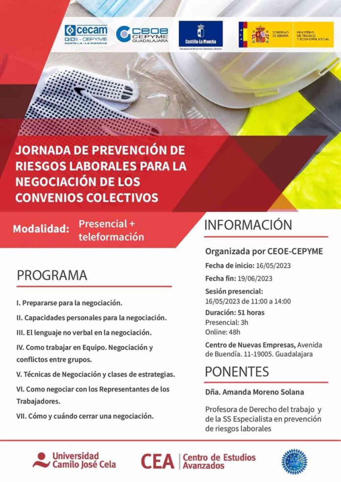 En esta ocasión, la jornada llevará por título “Prevención de riesgos laborales para la negociación de los convenios colectivos” y constará de una sesión presencial el martes, 16 de mayo, en el centro de nuevas empresas de Guadalajara, seguida del resto del curso en la modalidad de teleformación, que se extenderá hasta el 19 de junio. La duración total del curso será de 48 horas.