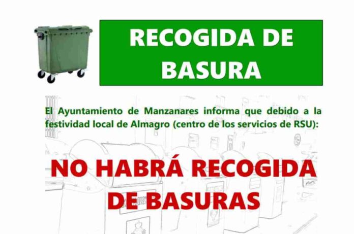 La noche del miércoles 4 de agosto al jueves 5 de agosto, no habrá recogida de basuras, así lo ha informado el Ayuntamiento de Manzanares (Ciudad Real).
