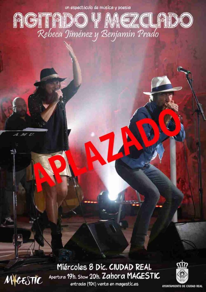 Aplazado el concierto “Agitado y Mezclado” de Rebeca Jiménez y Benjamín Prado, por motivos de salud, que estaba previsto para el miércoles 8 de diciembre en la sala Zahora Magestic de Ciudad Real.