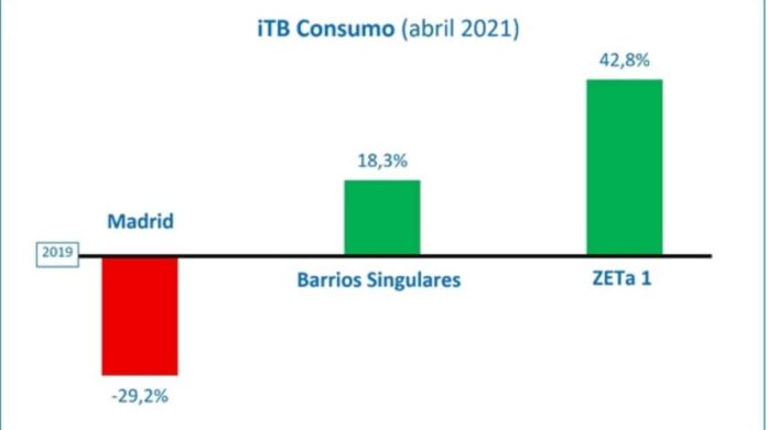Según el iTB, la caída de consumo en Madrid en abril respecto al mismo mes de 2019 se sitúo en un (-29,2%), muy cerca de marzo (-28%) y muy por debajo del (-58,8%) de enero. “Un dato muy positivo -indica Pablo Beltrán, CEO de TrueBroker- si se tiene en cuenta el mal tiempo que ha caracterizado este mes”.