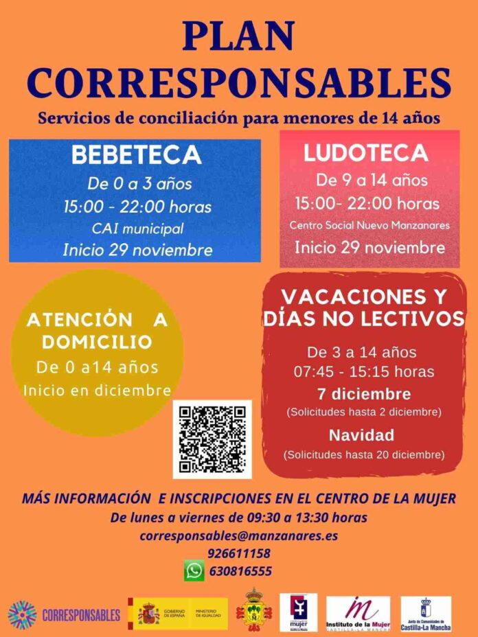 Desde el 29 de noviembre, se encuentra en marcha el plan ‘Corresponsables’ en Manzanares (Ciudad Real). Iniciativa impulsada por el Ministerio y la Consejería de Igualdad de Castilla-La Mancha. Y el Ayuntamiento ha puesto en marcha nuevos servicios de conciliación dirigidos a menores de cero a catorce años. Son cuatro: bebeteca, ludoteca, atención a domicilio y el servicio de conciliación para días no lectivos.