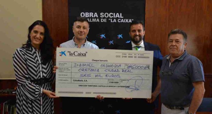 Una ayuda económica para promover la autonomía personal, consistente en un cheque de 6.000 euros ha entregado el director de Caixabank en Daimiel, Juan Antonio Ucendo, quien ha estado acompañado de directora del Área de Negocio de CaixaBank en Ciudad Real, María Dolores Garrido Moreno. Este es un aporte de la Obra Social “La Caixa” a la Federación Provincial de Asociaciones de Personas con Discapacidad Física y Orgánica (Orentania Ciudad Real) a través de su al presidente, Eloy Sánchez de la Nieta y el gerente de dicha institución, Pedro García Moreno.