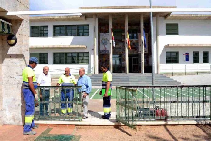 Crescencio Juárez, concejal de Urbanismo, se ha referido a que en lo que concierne a los colegios se están llevando a cabo actuaciones de mantenimiento generalizado como repintado de aulas y pasillos y cambio de arena en los areneros de infantil. Pero también otras más específicas de accesibilidad. Concretamente, en el “Virgen de la Sierra” se están realizando adaptaciones que consisten en instalar cintas de vinilo en las escaleras y una puerta accesible y en pintar paredes y pilares con colores llamativos para facilitar su visión. Además, ha destacado Crescencio Juárez, que se están pintando todos los viales del pueblo, que estarán listos antes de que de comienzo la feria y fiestas de septiembre.