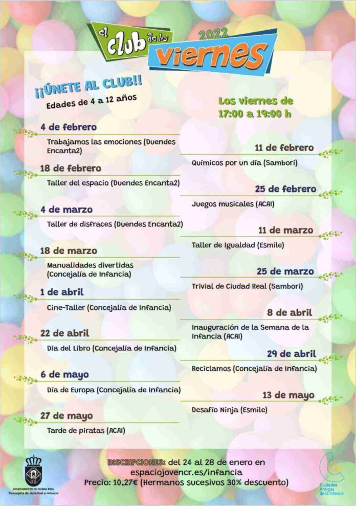 Para niños con edades de 4 a 12 años. El precio es de 10,27 €. Descargar Autorización Familiar (para entregar en la Concejalía de Infancia el día de comienzo de la actividad): https://www.espaciojovencr.es/index.php/concejalia-infancia/club-de-los-viernes/301-el-club-de-los-viernes-de-febrero-a-mayo-2022