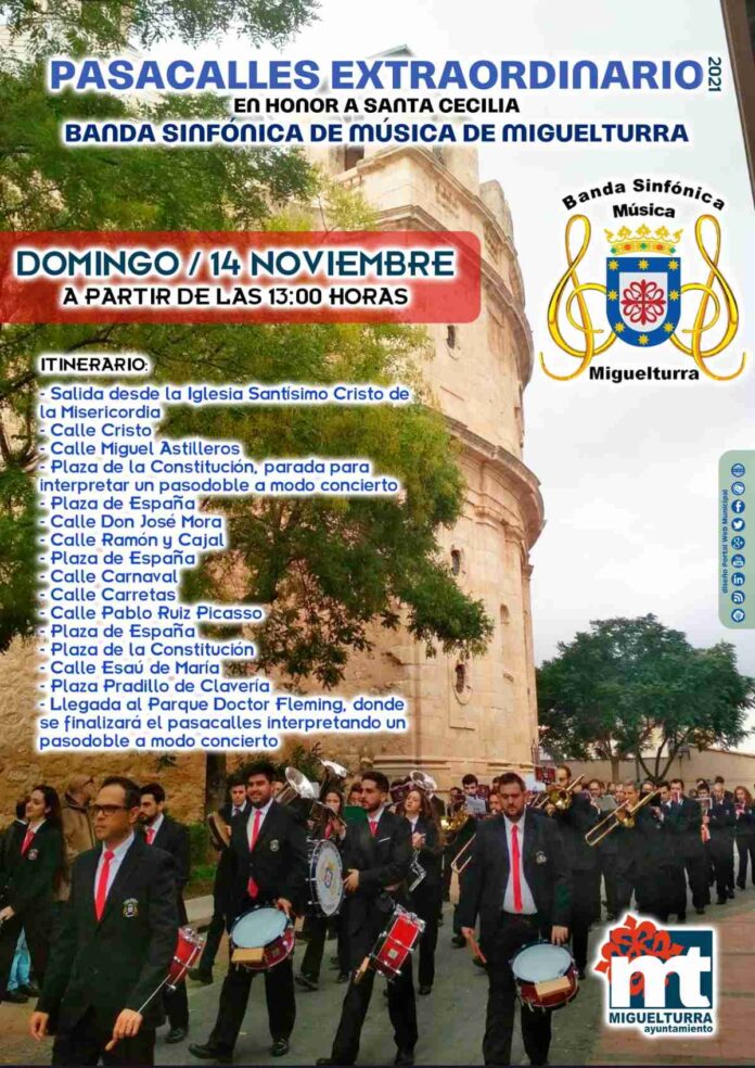 Este domingo, 14 de noviembre, se celebrará un pasacalles en honor a Santa Cecilia por la Banda Sinfónica de Miguelturra (Ciudad Real). El mismo será a partir de la 1 de la tarde.
