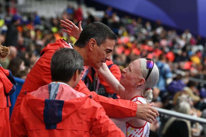 El presidente del Gobierno, Pedro Sánchez, saluda a la atleta paralímpica Susana Rodríguez en las gradas del Estadio de Francia en la jornada matutina de atletismo. | Foto: Pool Moncloa/Borja Puig de la Bellacasa