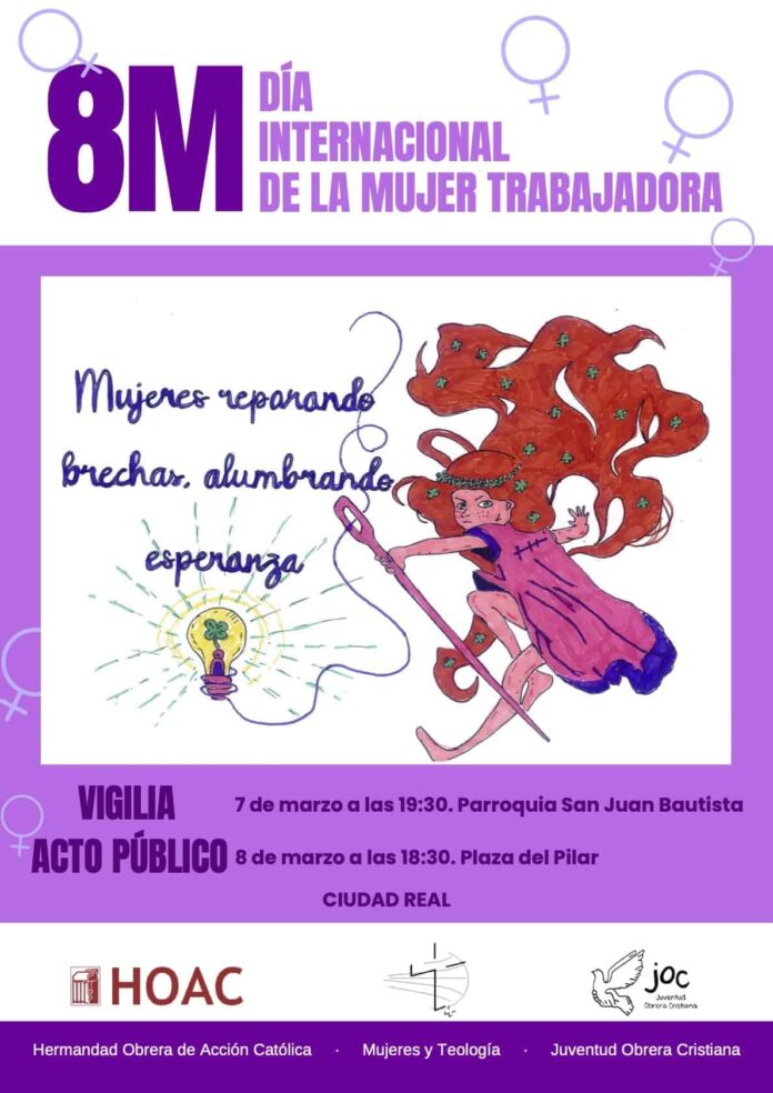 Con motivo de la celebración del Día Internacional de la Mujer, estas entidades eclesiales han organizado una vigilia, que tendrá lugar el jueves, 7 de marzo a las 19:30 en la Parroquia de San Juan Bautista de Ciudad Real y un acto público en la Plaza del Pilar a las 18:30 el mismo día 8 de marzo.