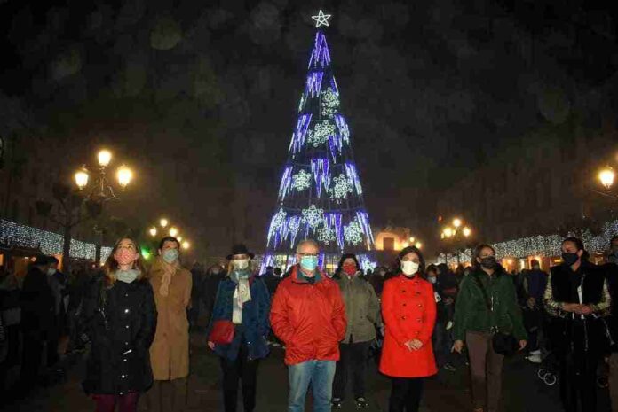La alcaldesa de Ciudad Real, Pilar Zamora, asistía esta tarde en la Plaza Mayor al tradicional encendido de las luces de navidad, acompañada de la concejala de Promoción Turística, Festejos y Tradiciones Populares, Eva Masías, así como de la enfermera del Hospital General de Ciudad Real, María Dolores Alfonso Díaz, que recogió este año el nombramiento de “Ciudadanos Ejemplares” en representación de todos los colectivos que han estado en primera línea de lucha contra la COVID-19.