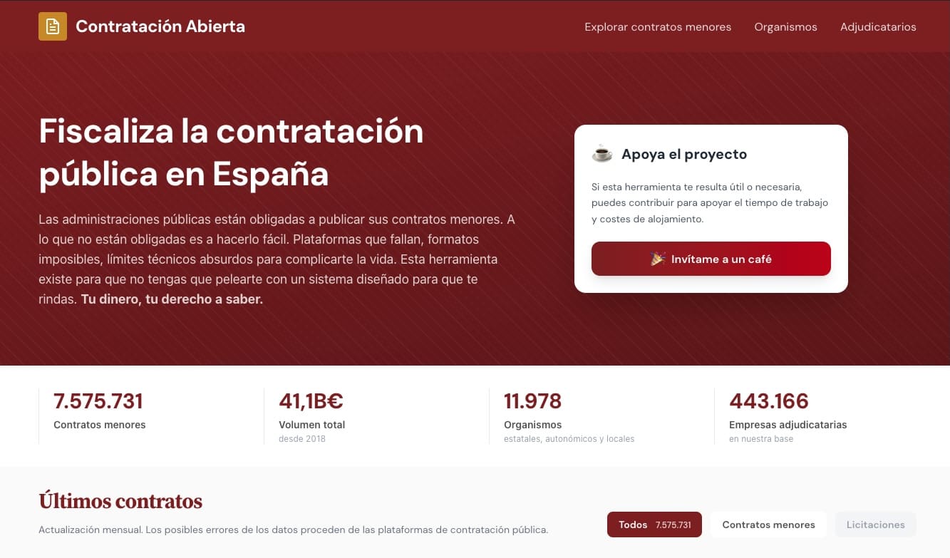 España ha estado publicando contratos menores en portales oficiales durante varios años, pero la consulta de esta información sigue siendo una tarea complicada para muchos ciudadanos. Las plataformas varían en formato según la administración y algunas presentan limitaciones técnicas que dificultan las búsquedas. Además, es común que los datos estén incompletos o contengan errores. En este contexto, ha surgido Contratación Abierta, una nueva herramienta destinada a simplificar la revisión de la contratación pública “menor”.