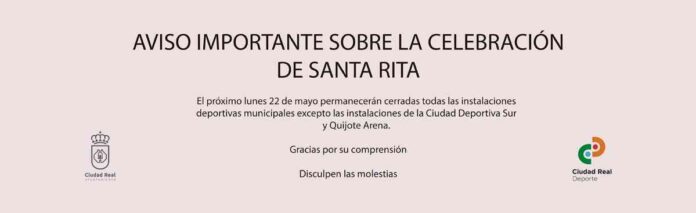 El 22 de mayo se celebra la Festividad de Santa Rita, y por ello algunas instalaciones deportivas de Ciudad Real no abrirán ese día, tal como ha dado a conocer el Patronato de Deportes de Ciudad Real. Recordemos que Santa Rita de Casia es la patrona de los funcionarios y funcionarias. Como ya es tradición en el día de dicha festividad, el ayuntamiento disfruta de un día inhábil.