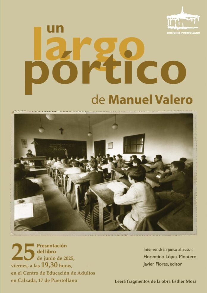 Manuel Valero presentará su novela «Un largo pórtico» de Ediciones Puertollano el próximo miércoles, 25 de octubre, a las 19:30 horas en el Centro de Adultos Antonio Machado, ubicado en Calzada, 17. Este evento contará con la participación del autor, Florentino López Montero, quien es un exalumno del colegio salesiano de Puertollano. Además, Esther Mora será la encargada de leer fragmentos de la obra durante el acto.